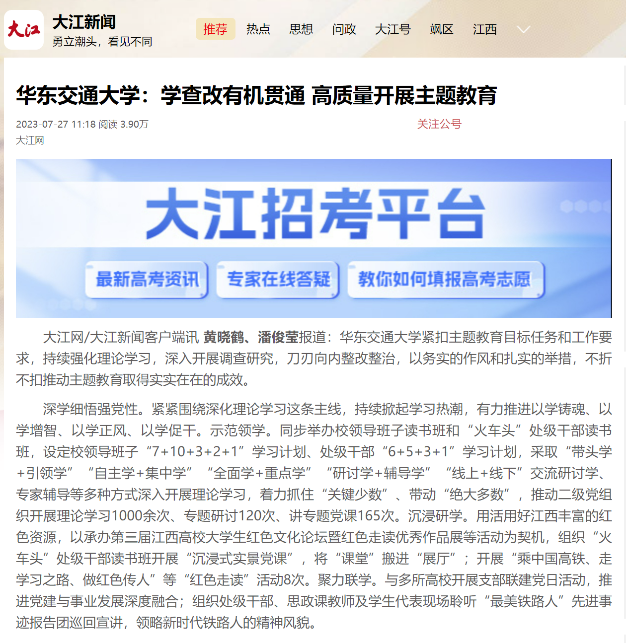 华东交通大学紧扣主题教育目标任务和工作要求,持续强化理论学习,深入开展调查研究,刀刃向内整改整治,以务实的作风和扎实的举措,不折不扣推动主题教育取得实实在在的成效。