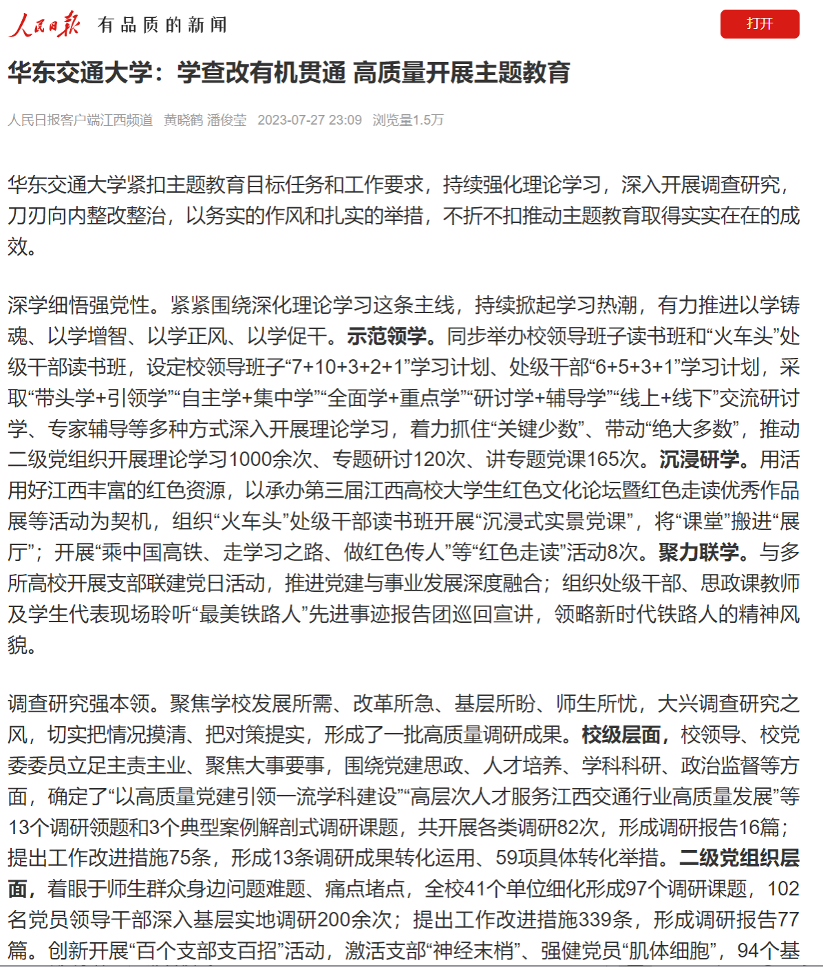 华东交通大学紧扣主题教育目标任务和工作要求,持续强化理论学习,深入开展调查研究,刀刃向内整改整治,以务实的作风和扎实的举措,不折不扣推动主题教育取得实实在在的成效。
