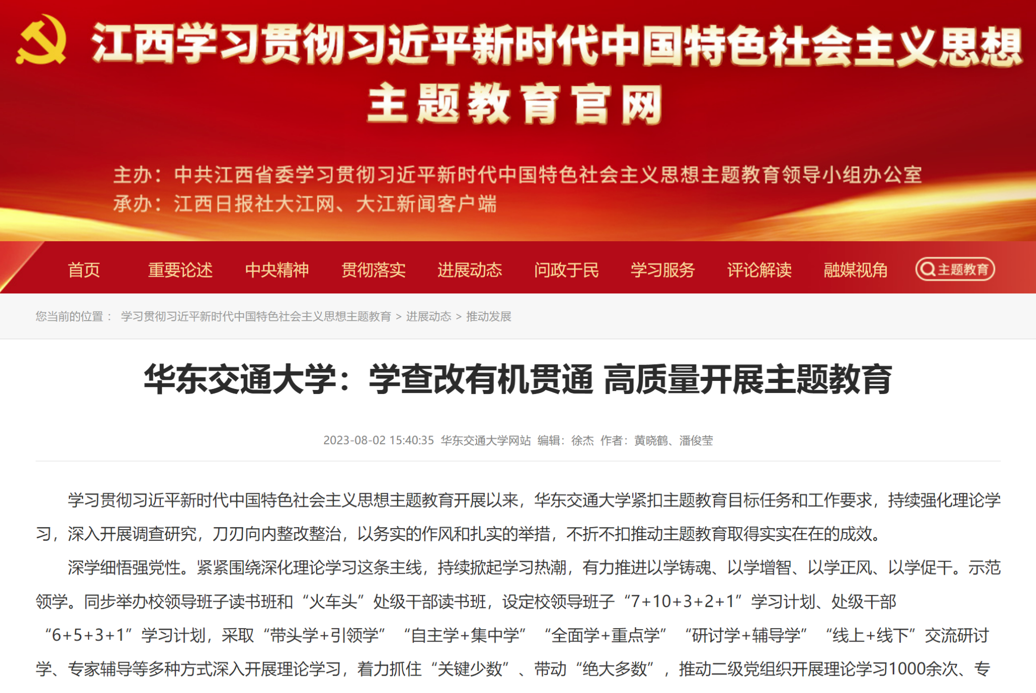 学习贯彻习近平新时代中国特色社会主义思想主题教育开展以来,华东交通大学紧扣主题教育目标任务和工作要求,持续强化理论学习,深入开展调查研究,刀刃向内整改整治,以务实的作风和扎实的举措,不折不扣推动主题教育取得实实在在的成效。