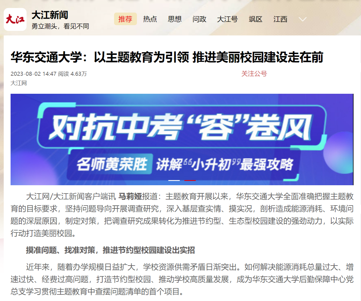 主题教育开展以来,华东交通大学全面准确把握主题教育的目标要求,坚持问题导向开展调查研究,深入基层查实情、摸实况,剖析造成能源消耗、环境问题的深层原因,制定对策,把调查研究成果转化为推进节约型、生态型校园建设的强劲动力,以实际行动打造美丽校园。