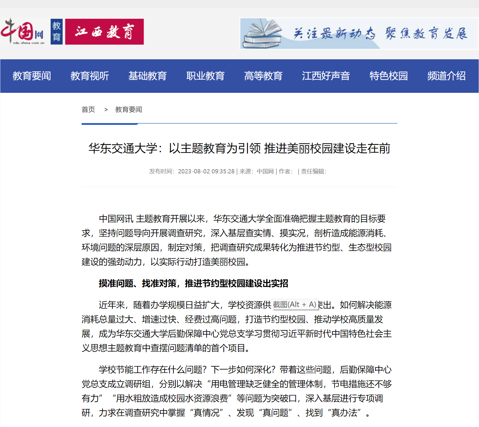 主题教育开展以来,华东交通大学全面准确把握主题教育的目标要求,坚持问题导向开展调查研究,深入基层查实情、摸实况,剖析造成能源消耗、环境问题的深层原因,制定对策,把调查研究成果转化为推进节约型、生态型校园建设的强劲动力,以实际行动打造美丽校园。