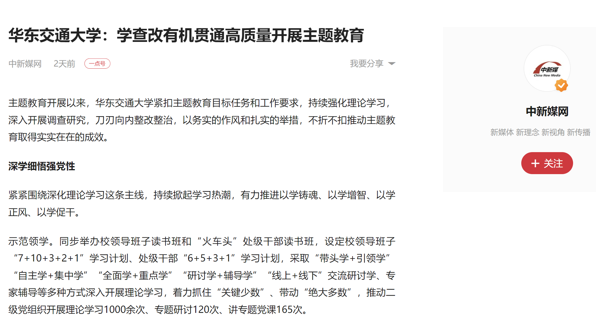 主题教育开展以来,华东交通大学紧扣主题教育目标任务和工作要求,持续强化理论学习,深入开展调查研究,刀刃向内整改整治,以务实的作风和扎实的举措,不折不扣推动主题教育取得实实在在的成效。