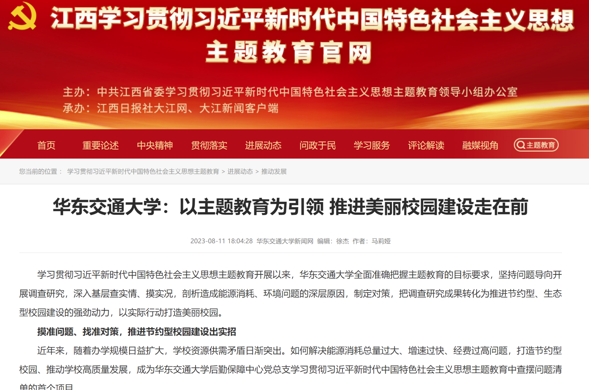 学习贯彻习近平新时代中国特色社会主义思想主题教育开展以来,学校全面准确把握主题教育的目标要求,坚持问题导向开展调查研究,深入基层查实情、摸实况,剖析造成能源消耗、环境问题的深层原因,制定对策,把调查研究成果转化为推进节约型、生态型校园建设的强劲动力,以实际行动打造美丽校园。