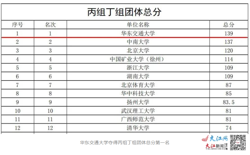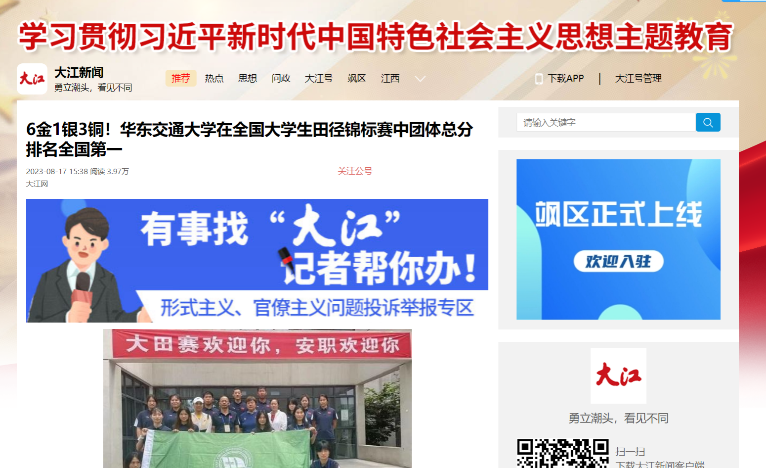 大江网/大江新闻客户端讯 第21届全国大学生田径锦标赛(简称“大田赛”)自8月10日开赛以来,经过6天紧张激烈的角逐,华东交通大学“火车头”田径队不畏强手、奋勇拼搏,一举斩获6金1银3铜的佳绩,夺得丙组丁组(高水平组、超级组)团体总分第一名、女子团体总分第一名,并荣获体育道德风尚奖。金牌数、团体总分均实现历史性突破,取得了学校自1997年首次组队参加大田赛以来的最好成绩。