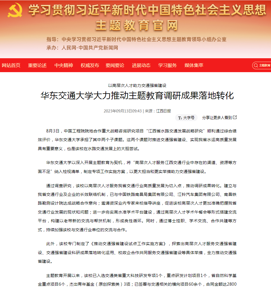 华东交通大学以深入开展主题教育为契机,将“高层次人才服务江西交通行业中存在的渠道、资源等方面不足”纳入检视清单,制定专项工作实施方案,以更大担当和更实举措助力交通强省建设。