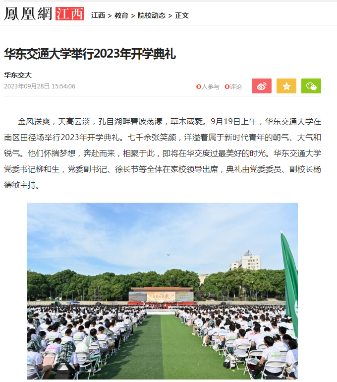 金风送爽,天高云淡,孔目湖畔碧波荡漾,草木葳蕤。9月19日上午,华东交通大学在南区田径场举行2023年开学典礼。七千余张笑颜,洋溢着属于新时代青年的朝气、大气和锐气。他们怀揣梦想,奔赴而来,相聚于此,即将在华交度过最美好的时光。华东交通大学党委书记柳和生,党委副书记、徐长节等全体在家校领导出席,典礼由党委委员、副校长杨德敏主持。