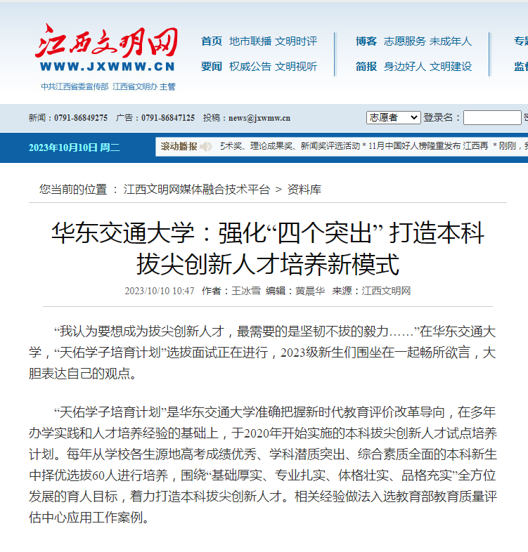 “天佑学子培育计划”是华东交通大学准确把握新时代教育评价改革导向,在多年办学实践和人才培养经验的基础上,于2020年开始实施的本科拔尖创新人才试点培养计划。每年从学校各生源地高考成绩优秀、学科潜质突出、综合素质全面的本科新生中择优选拔60人进行培养,围绕“基础厚实、专业扎实、体格壮实、品格充实”全方位发展的育人目标,着力打造本科拔尖创新人才。相关经验做法入选教育部教育质量评估中心应用工作案例。