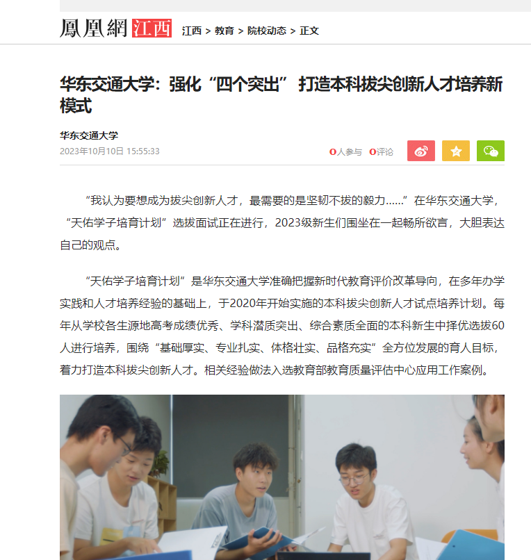 “天佑学子培育计划”是华东交通大学准确把握新时代教育评价改革导向,在多年办学实践和人才培养经验的基础上,于2020年开始实施的本科拔尖创新人才试点培养计划。每年从学校各生源地高考成绩优秀、学科潜质突出、综合素质全面的本科新生中择优选拔60人进行培养,围绕“基础厚实、专业扎实、体格壮实、品格充实”全方位发展的育人目标,着力打造本科拔尖创新人才。相关经验做法入选教育部教育质量评估中心应用工作案例。