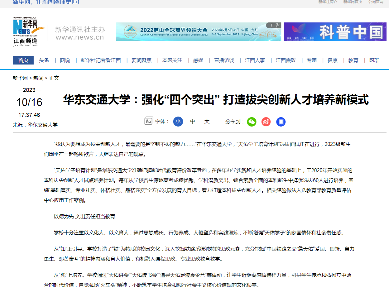【新华网】华东交通大学:强化“四个突出” 打造拔尖创新人才培养新模式
