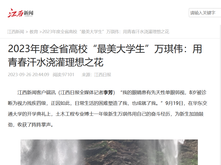 “我的眼睛患有先天性单眼弱视,8岁被诊断为视力残疾四级,正因如此,日常生活的困难塑造了我,也成就了我。”9月19日,在华东交通大学的开学典礼上,土木工程专业博士一年级新生万琪伟用自己的奋斗经历,为新生加油鼓劲,收获了阵阵掌声。