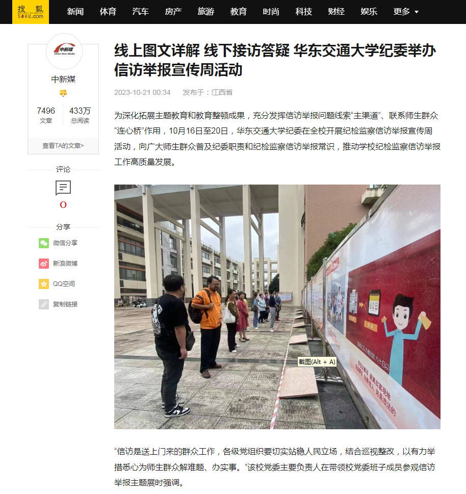 据悉,该校纪委连续一周在校内主干道上设立了现场宣传接访点,制作发放了3000余份信访举报指南。全校各基层党组织开展了《信访工作条例》和《纪检监察机关检举控告规则》的集中学习。各二级党组织依托自有宣传平台,结合单位实际积极开展信访举报知识宣传教育,不断提升宣传实效。