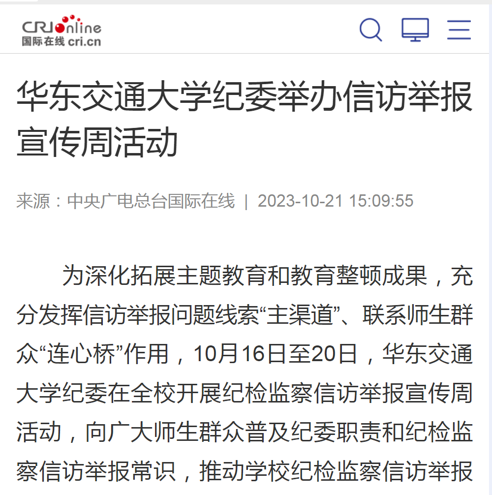 为深化拓展主题教育和教育整顿成果,充分发挥信访举报问题线索“主渠道”、联系师生群众“连心桥”作用,10月16日至20日,华东交通大学纪委在全校开展纪检监察信访举报宣传周活动,向广大师生群众普及纪委职责和纪检监察信访举报常识,推动学校纪检监察信访举报工作高质量发展。