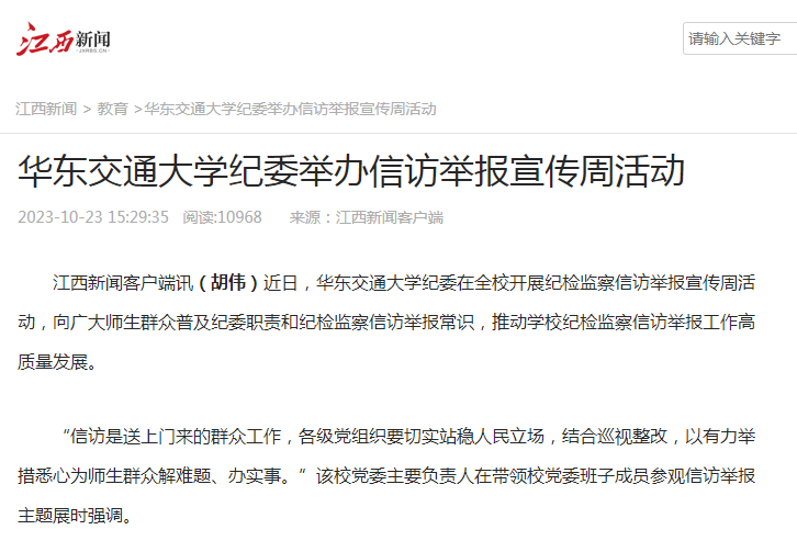 近日,华东交通大学纪委在全校开展纪检监察信访举报宣传周活动,向广大师生群众普及纪委职责和纪检监察信访举报常识,推动学校纪检监察信访举报工作高质量发展。