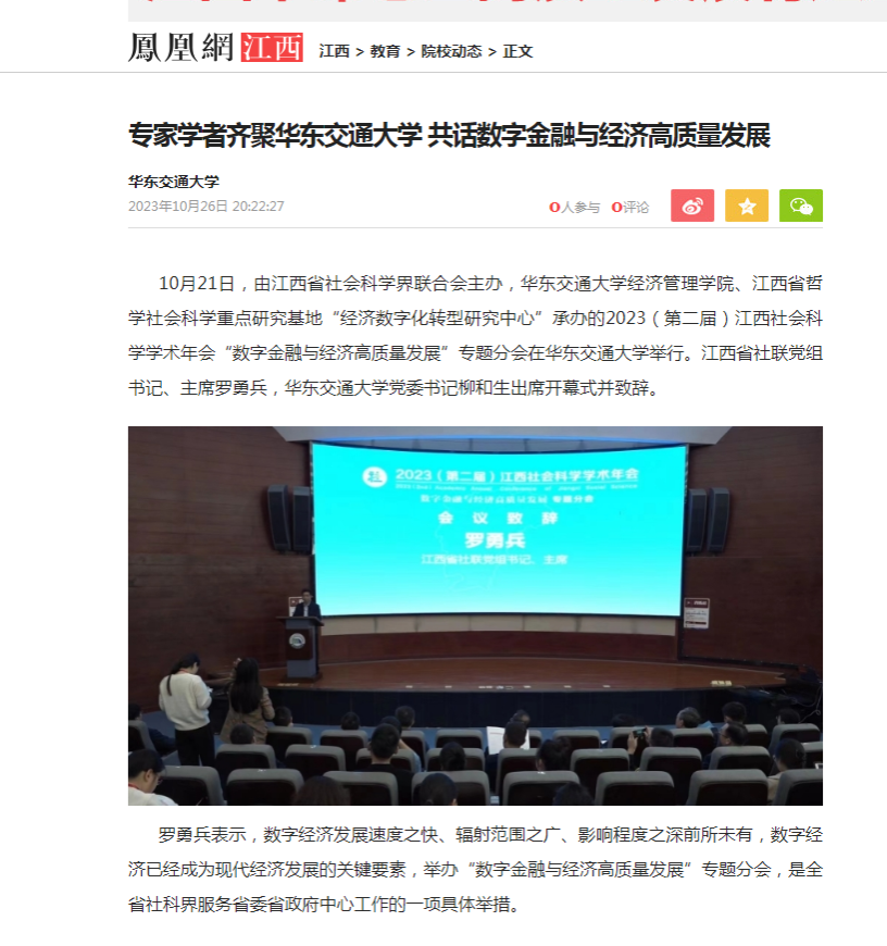 10月21日,由江西省社会科学界联合会主办,华东交通大学经济管理学院、江西省哲学社会科学重点研究基地“经济数字化转型研究中心”承办的2023(第二届)江西社会科学学术年会“数字金融与经济高质量发展”专题分会在华东交通大学举行。江西省社联党组书记、主席罗勇兵,华东交通大学党委书记柳和生出席开幕式并致辞。