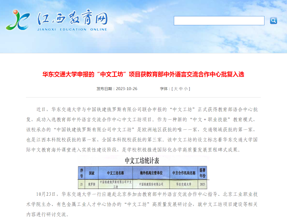 【江西教育网】华东交通大学申报的“中文工坊”项目获教育部中外语言交流合作中心批复入选