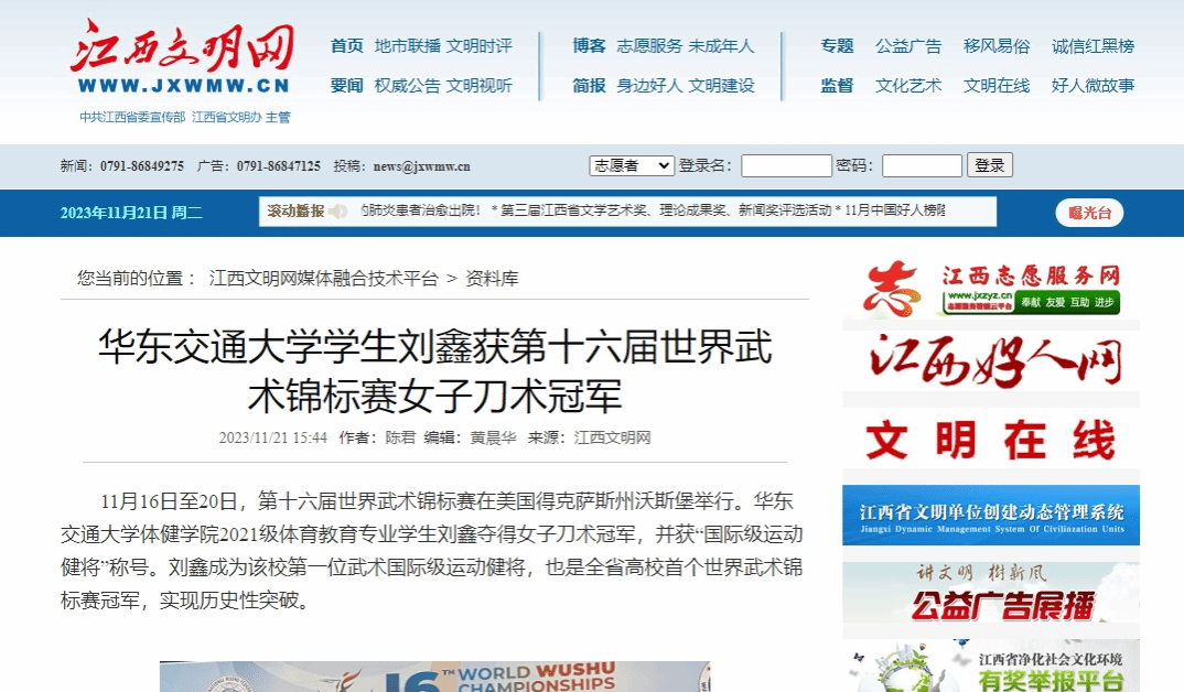 11月16日至20日,第十六届世界武术锦标赛在美国得克萨斯州沃斯堡举行。华东交通大学体健学院2021级体育教育专业学生刘鑫夺得女子刀术冠军,并获“国际级运动健将”称号。刘鑫成为该校第一位武术国际级运动健将,也是全省高校首个世界武术锦标赛冠军,实现历史性突破。