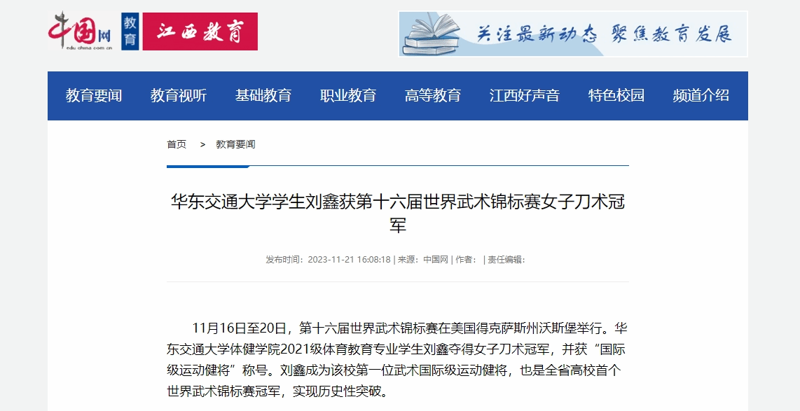11月16日至20日,第十六届世界武术锦标赛在美国得克萨斯州沃斯堡举行。华东交通大学体健学院2021级体育教育专业学生刘鑫夺得女子刀术冠军,并获“国际级运动健将”称号。刘鑫成为该校第一位武术国际级运动健将,也是全省高校首个世界武术锦标赛冠军,实现历史性突破。