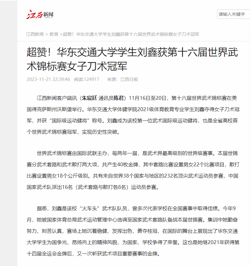 据悉,刘鑫是该校“火车头”武术队队员,曾多次代表学校在全国赛事中取得佳绩。今年9月,她被国家体育总局武术运动管理中心选调至国家武术套路队备战本届世锦赛。集训中她勤奋努力、刻苦认真,赛场上她沉着稳健、发挥出色,勇夺桂冠,在国际的舞台上展现出了华东交通大学学生为国争光、昂扬向上的精神风貌,为国家、学校争得了荣誉。这也是她继2021年获得第十四届全运会金牌后,又一次斩获武术项目重要赛事的金牌。