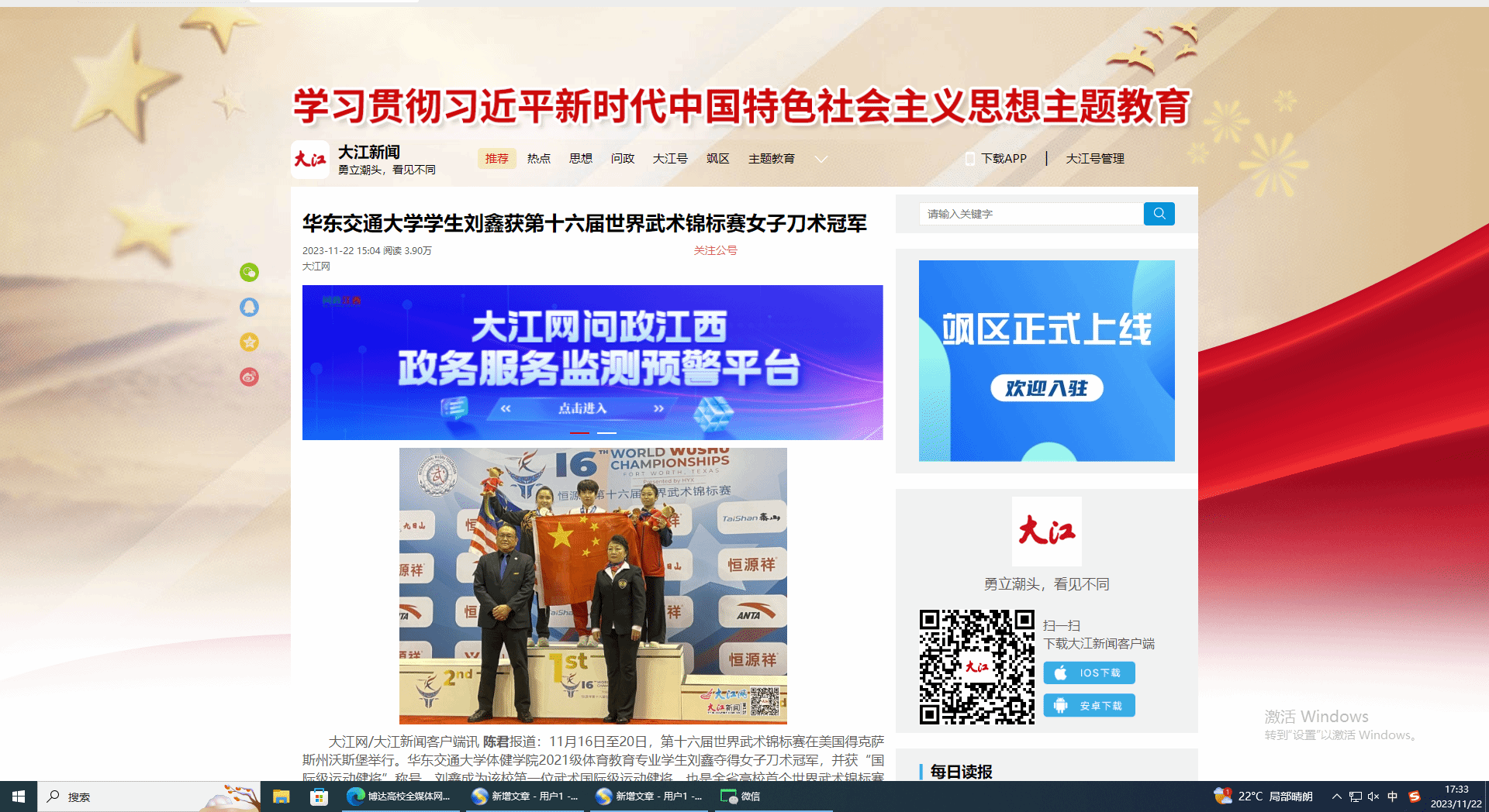 11月16日至20日,第十六届世界武术锦标赛在美国得克萨斯州沃斯堡举行。华东交通大学体健学院2021级体育教育专业学生刘鑫夺得女子刀术冠军,并获“国际级运动健将”称号。刘鑫成为该校第一位武术国际级运动健将,也是全省高校首个世界武术锦标赛冠军,实现历史性突破。