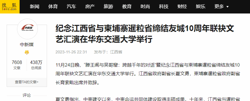 育索毗表示,此次文化交流活动是暹粒省和江西省之间兄弟般友谊的生动体现。江西拥有滕王阁,暹粒有吴哥窟,双方在保护文化遗产以及促进文旅合作方面有着巨大的潜力。期待未来两省友好关系更进一步、合作更加密切。