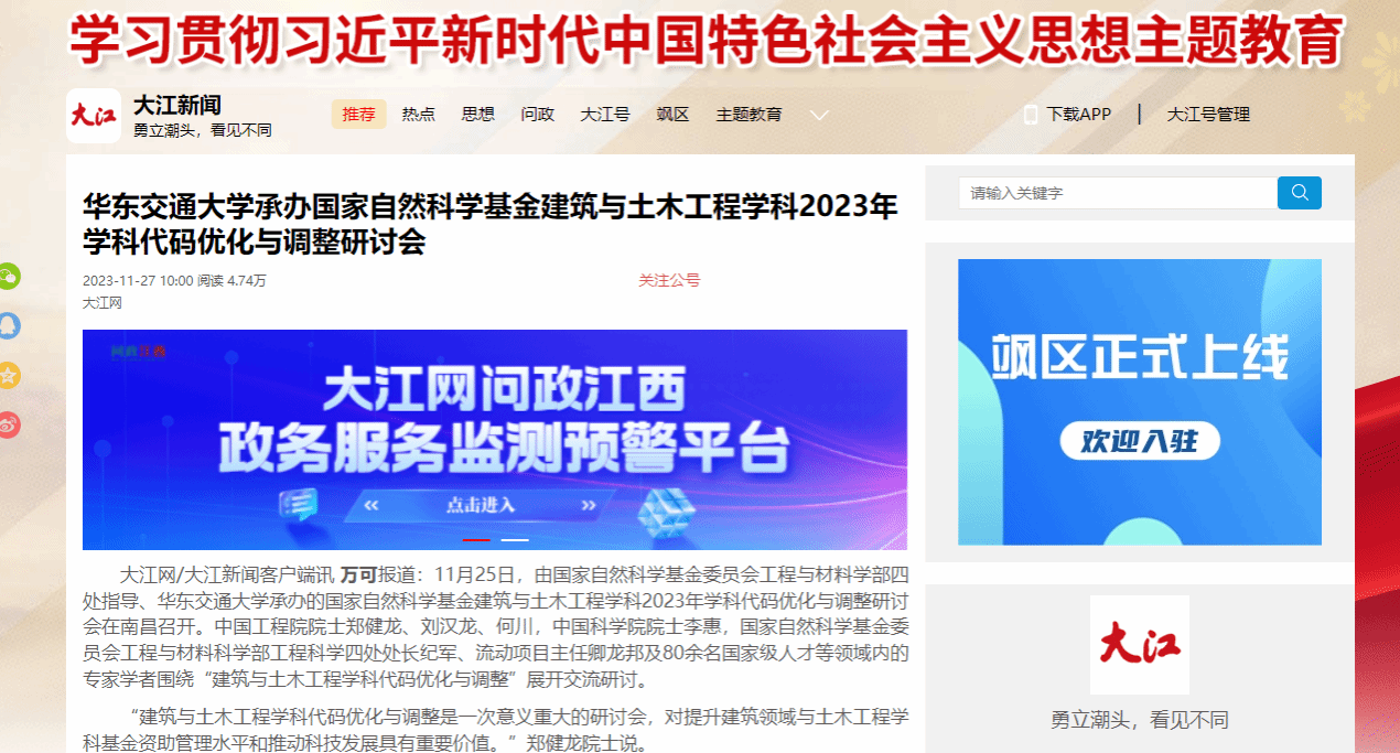 11月25日,由国家自然科学基金委员会工程与材料学部四处指导、华东交通大学承办的国家自然科学基金建筑与土木工程学科2023年学科代码优化与调整研讨会在南昌召开。中国工程院院士郑健龙、刘汉龙、何川,中国科学院院士李惠,国家自然科学基金委员会工程与材料科学部工程科学四处处长纪军、流动项目主任卿龙邦及80余名国家级人才等领域内的专家学者围绕“建筑与土木工程学科代码优化与调整”展开交流研讨。