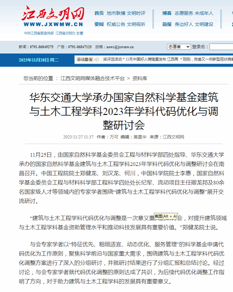 11月25日,由国家自然科学基金委员会工程与材料学部四处指导、华东交通大学承办的国家自然科学基金建筑与土木工程学科2023年学科代码优化与调整研讨会在南昌召开。中国工程院院士郑健龙、刘汉龙、何川,中国科学院院士李惠,国家自然科学基金委员会工程与材料科学部工程科学四处处长纪军、流动项目主任卿龙邦及80余名国家级人才等领域内的专家学者围绕“建筑与土木工程学科代码优化与调整”展开交流研讨。