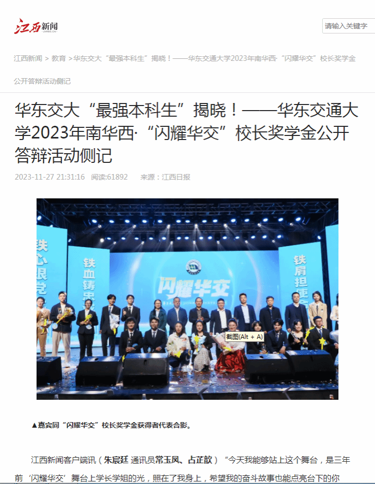 校长奖学金,是该校授予在校本科生的最高荣誉,每学年全校范围内评选约10名,每人奖励1万元人民币。当天下午,华东交通大学面向全校师生开展2023年南华西·“闪耀华交”校长奖学金公开答辩活动,校党委书记柳和生,校党委副书记、校长徐长节等校领导,省内外专家评委、校内师生代表等共计1300余人,见证了一堂教学相长、榜样引领的思政大课。20名优秀学子上台讲述大学成长故事,学业导师为其登台推介,专家评委现场问辩,候选人“人均保研”“数门满分”的奋斗故事让台下观众掌声不断。