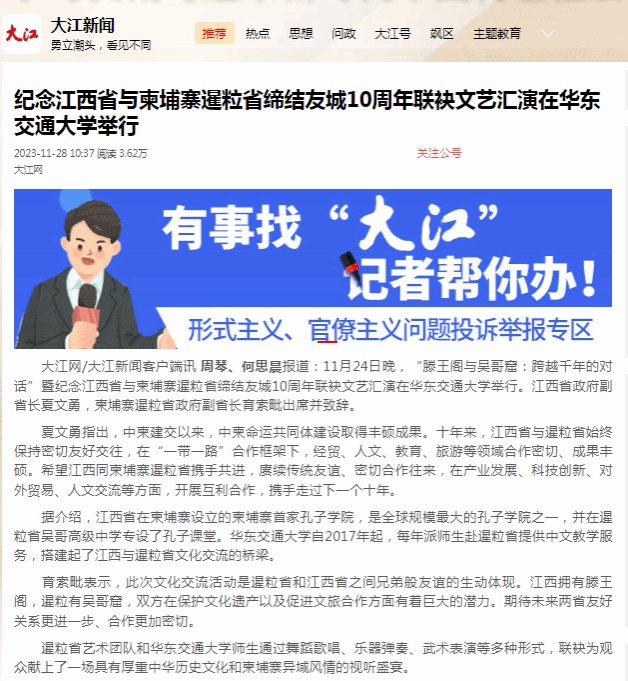 据介绍,江西省在柬埔寨设立的柬埔寨首家孔子学院,是全球规模最大的孔子学院之一,并在暹粒省吴哥高级中学专设了孔子课堂。华东交通大学自2017年起,每年派师生赴暹粒省提供中文教学服务,搭建起了江西与暹粒省文化交流的桥梁。