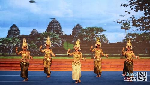 柬埔寨舞蹈《飞天》,舞者们身着柬埔寨传统服饰,用美丽而优雅的舞姿展现民族特色;被列入联合国教科文组织《人类非物质文化遗产代表作名录》的舞蹈《哈努曼戏美人鱼》,通过灵活多变的肢体语言,以舞传意,让观众了解到其孔剧的精髓;《拜林孔雀舞》,在柬埔寨民族音乐的伴奏下,舞者以优美的身姿,使得两只“绿孔雀”栩栩如生、活灵活现。