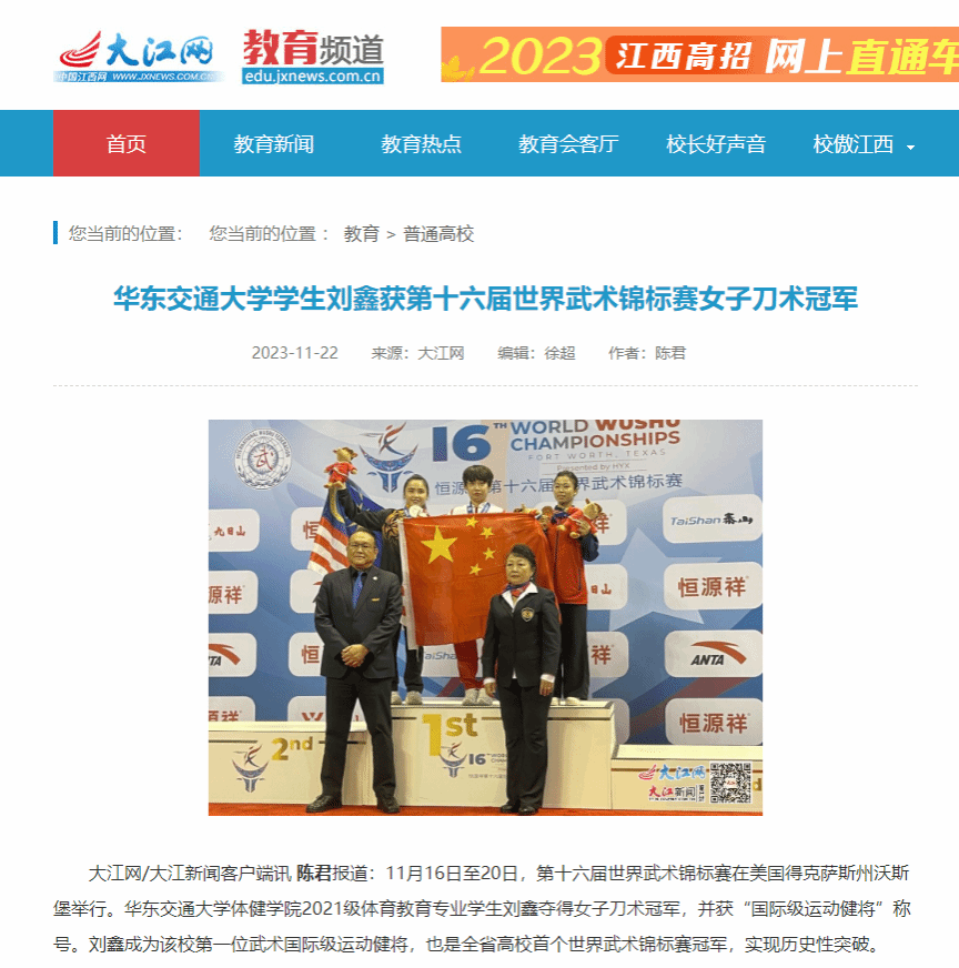 11月16日至20日,第十六届世界武术锦标赛在美国得克萨斯州沃斯堡举行。华东交通大学体健学院2021级体育教育专业学生刘鑫夺得女子刀术冠军,并获“国际级运动健将”称号。刘鑫成为该校第一位武术国际级运动健将,也是全省高校首个世界武术锦标赛冠军,实现历史性突破。