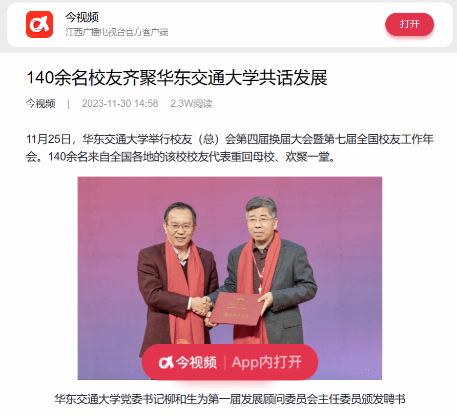 网站链接:140余名校友齐聚华东交通大学共话发展 - 今视频 (jxgdw.com)