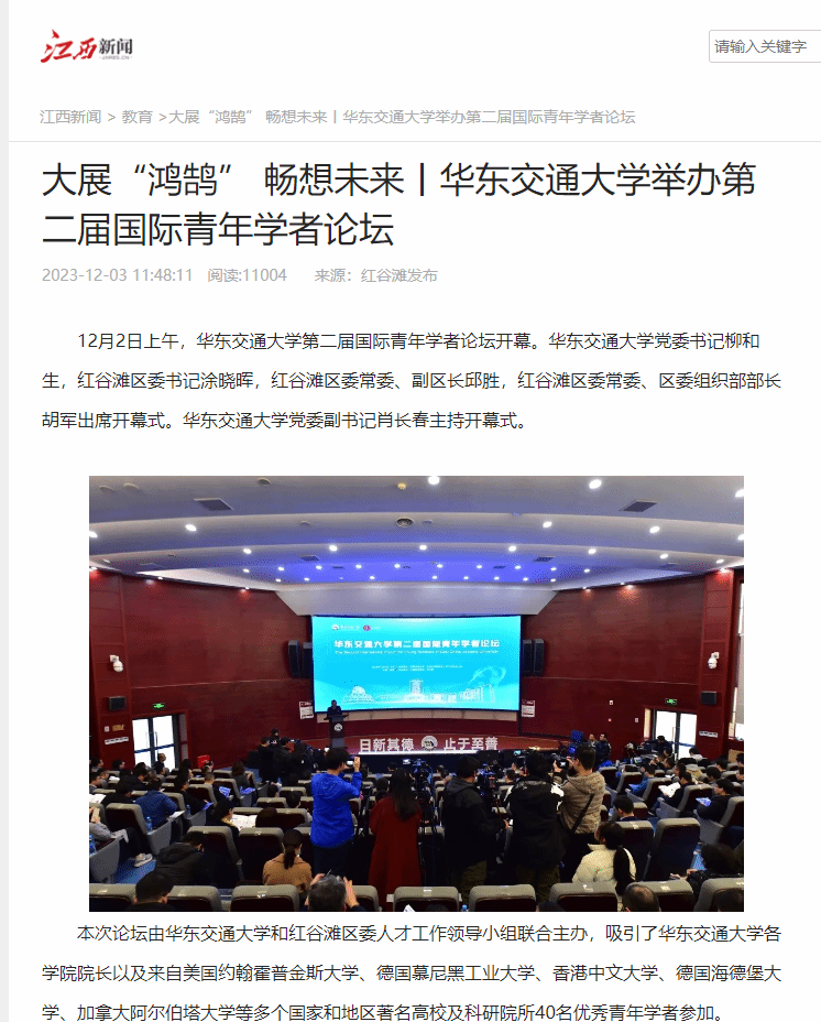 本次论坛由华东交通大学和红谷滩区委人才工作领导小组联合主办,吸引了华东交通大学各学院院长以及来自美国约翰霍普金斯大学、德国慕尼黑工业大学、香港中文大学、德国海德堡大学、加拿大阿尔伯塔大学等多个国家和地区著名高校及科研院所40名优秀青年学者参加。