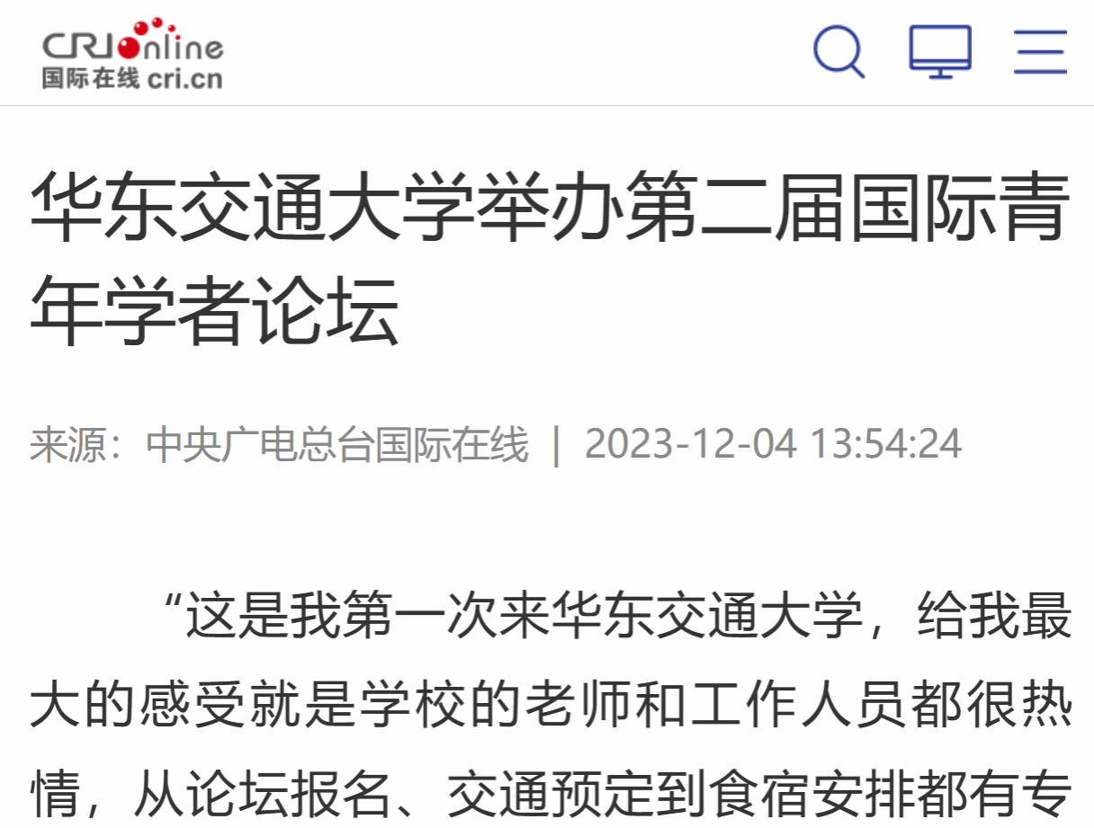 “这是我第一次来华东交通大学,给我最大的感受就是学校的老师和工作人员都很热情,从论坛报名、交通预定到食宿安排都有专门的老师帮忙跟进,考虑非常周到。学校最让我眼前一亮的是对优秀人才的吸引力,不管是这次国际论坛的参会人员还是已有的师资,很多都是领域内的知名学者,充分说明了华东交通大学在国内外的影响力越来越大。”来自约翰斯·霍普金斯大学的青年学者杨磊说。