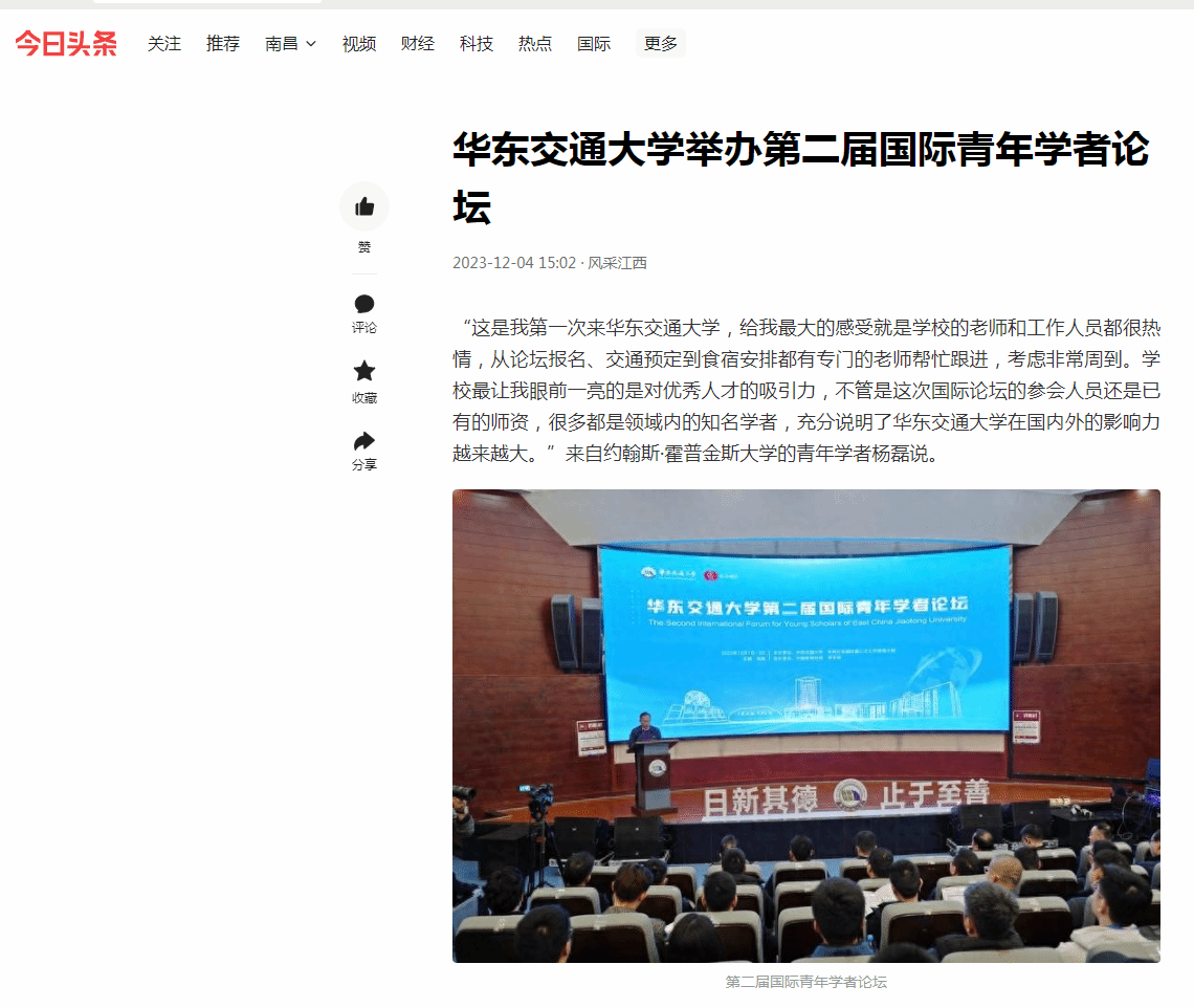 12月2日,华东交通大学第二届国际青年学者论坛成功举办,来自美国约翰斯·霍普金斯大学、德国慕尼黑工业大学、香港中文大学、加拿大阿尔伯塔大学等10余个国家和地区著名高校及科研院所40余名优秀青年学者代表齐聚一堂,共商人才大计,共谋事业发展。主论坛面向全球直播,线上参会学者近500人。