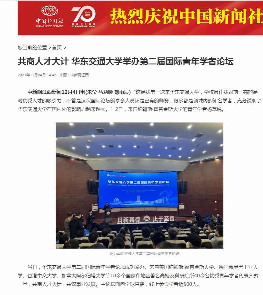 当日,华东交通大学第二届国际青年学者论坛成功举办。来自美国约翰斯·霍普金斯大学、德国慕尼黑工业大学、香港中文大学、加拿大阿尔伯塔大学等10余个国家和地区著名高校及科研院所40余名优秀青年学者代表齐聚一堂,共商人才大计,共谋事业发展。主论坛面向全球直播,线上参会学者近500人。