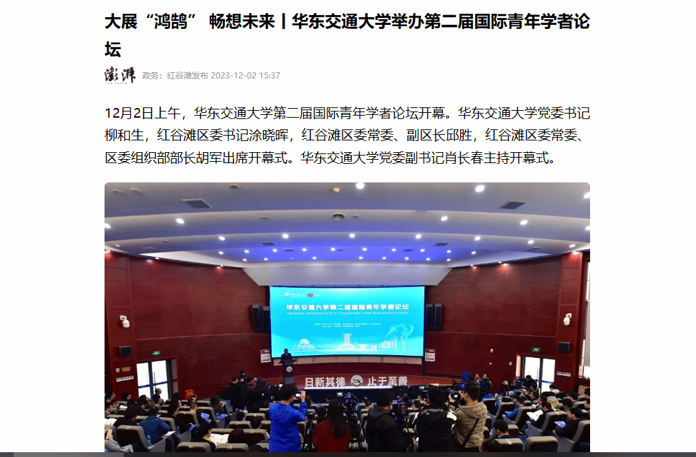 网址链接:大展“鸿鹄” 畅想未来丨华东交通大学举办第二届国际青年学者论坛 (thepaper.cn)