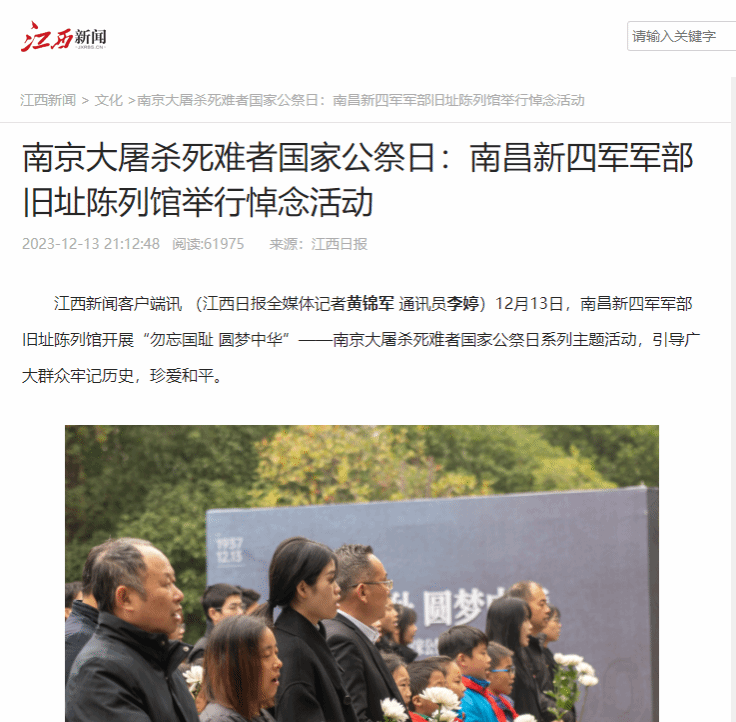 (江西日报全媒体记者黄锦军 通讯员李婷)12月13日,南昌新四军军部旧址陈列馆开展“勿忘国耻 圆梦中华”——南京大屠杀死难者国家公祭日系列主题活动,引导广大群众牢记历史,珍爱和平。