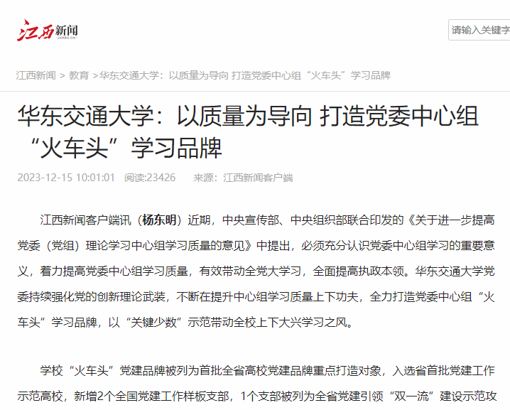 近期,中央宣传部、中央组织部联合印发的《关于进一步提高党委(党组)理论学习中心组学习质量的意见》中提出,必须充分认识党委中心组学习的重要意义,着力提高党委中心组学习质量,有效带动全党大学习,全面提高执政本领。华东交通大学党委持续强化党的创新理论武装,不断在提升中心组学习质量上下功夫,全力打造党委中心组“火车头”学习品牌,以“关键少数”示范带动全校上下大兴学习之风。