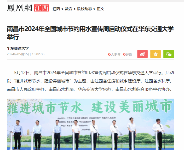5月12日,南昌市2024年全国城市节约用水宣传周启动仪式在华东交通大学举行。活动以“推进城市节水,建设美丽城市”为主题,由江西省住房和城乡建设厅、江西省水利厅、南昌市人民政府主办,南昌市水利局、华东交通大学承办,南昌市水利综合服务中心协办。