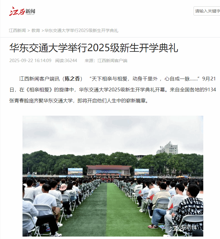 “天下相亲与相爱,动身千里外 ,心自成一脉……”9月21日,在《相亲相爱》的旋律中,华东交通大学2025级新生开学典礼开幕。来自全国各地的9134张青春脸庞齐聚华东交通大学,即将开启他们人生中的崭新篇章。