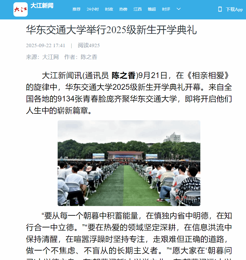 9月21日,在《相亲相爱》的旋律中,华东交通大学2025级新生开学典礼开幕。来自全国各地的9134张青春脸庞齐聚华东交通大学,即将开启他们人生中的崭新篇章。