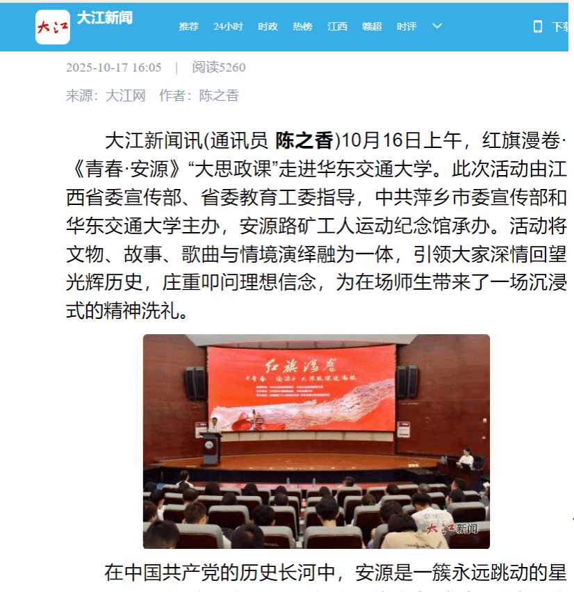 10月16日上午,红旗漫卷·《青春·安源》“大思政课”走进华东交通大学。此次活动由江西省委宣传部、省委教育工委指导,中共萍乡市委宣传部和华东交通大学主办,安源路矿工人运动纪念馆承办。活动将文物、故事、歌曲与情境演绎融为一体,引领大家深情回望光辉历史,庄重叩问理想信念,为在场师生带来了一场沉浸式的精神洗礼。