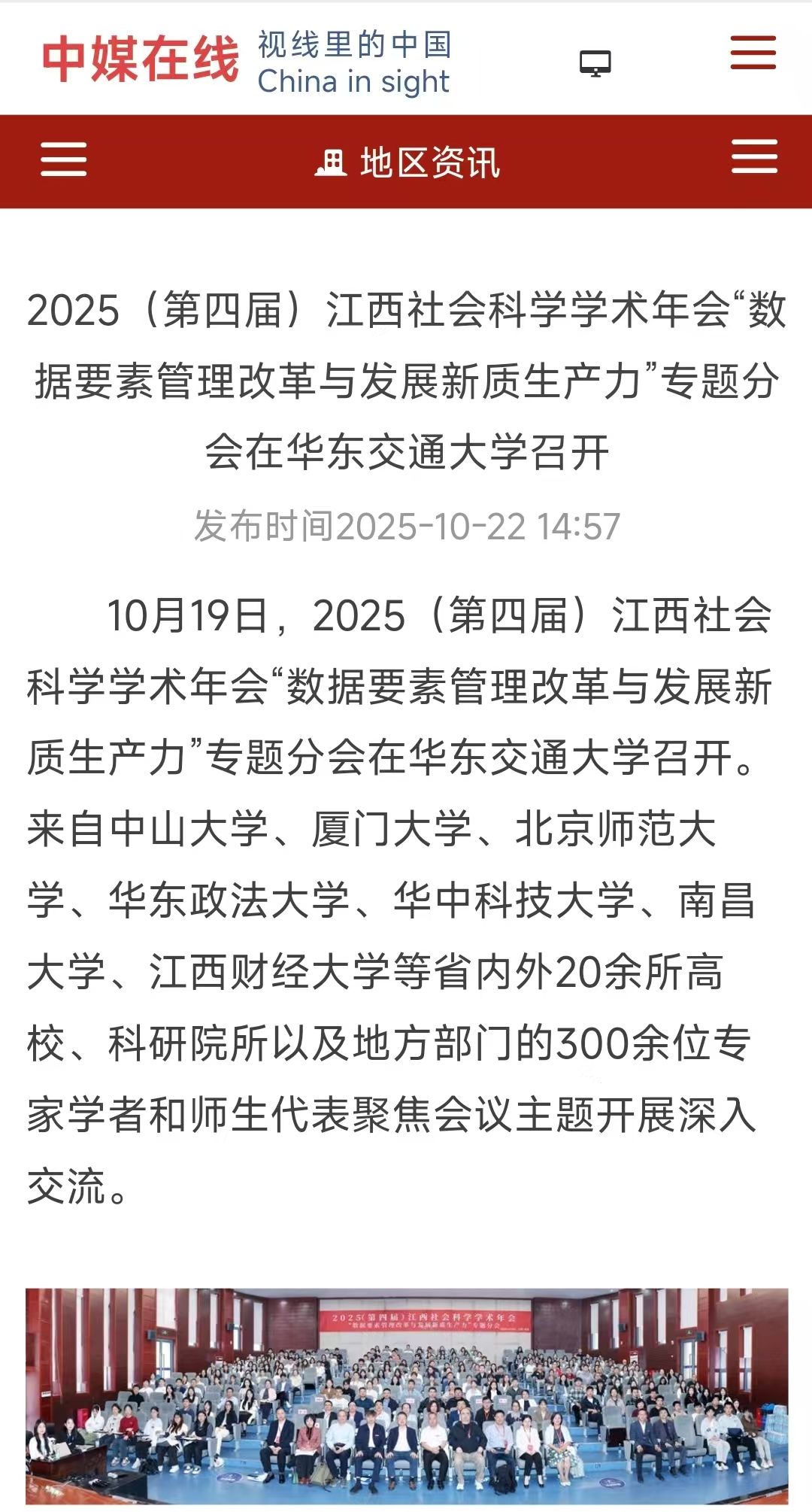 10月19日,2025(第四届)江西社会科学学术年会“数据要素管理改革与发展新质生产力”专题分会在华东交通大学召开。来自中山大学、厦门大学、北京师范大学、华东政法大学、华中科技大学、南昌大学、江西财经大学等省内外20余所高校、科研院所以及地方部门的300余位专家学者和师生代表聚焦会议主题开展深入交流。