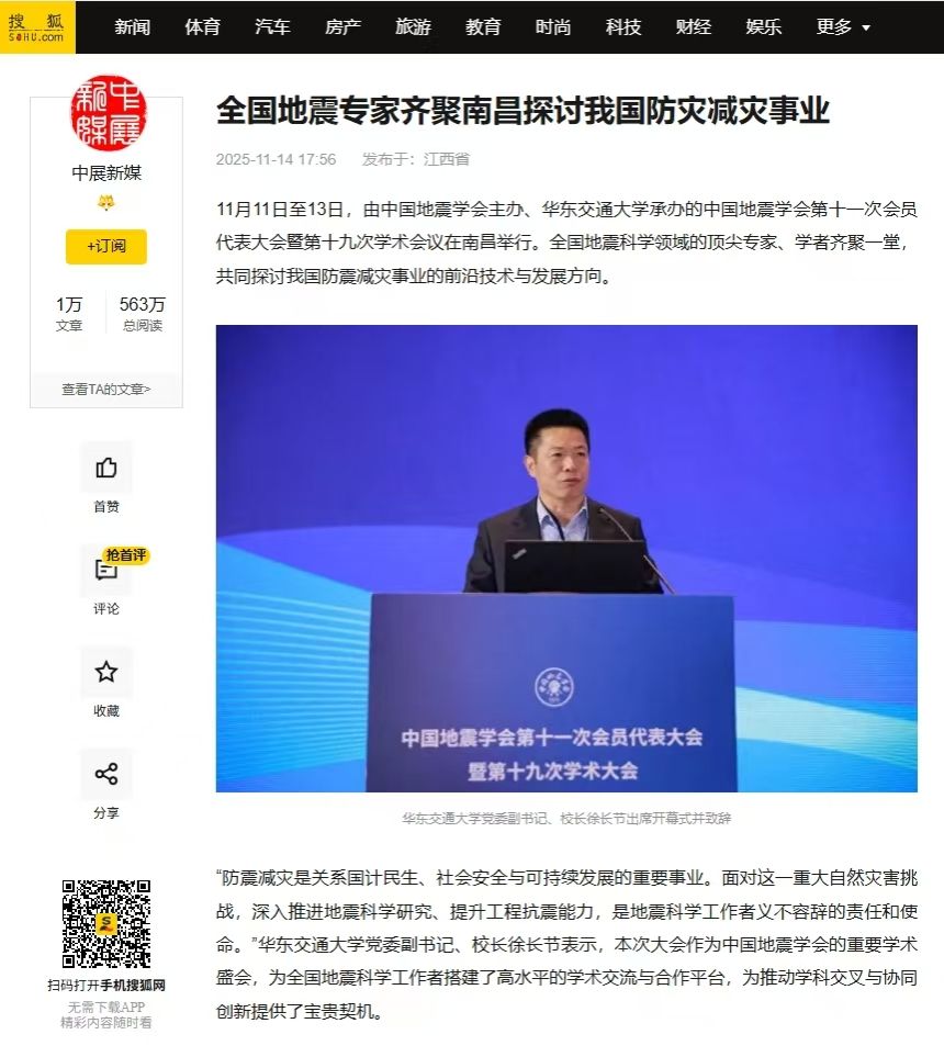 “防震减灾是关系国计民生、社会安全与可持续发展的重要事业。面对这一重大自然灾害挑战,深入推进地震科学研究、提升工程抗震能力,是地震科学工作者义不容辞的责任和使命。”华东交通大学党委副书记、校长徐长节表示,本次大会作为中国地震学会的重要学术盛会,为全国地震科学工作者搭建了高水平的学术交流与合作平台,为推动学科交叉与协同创新提供了宝贵契机。