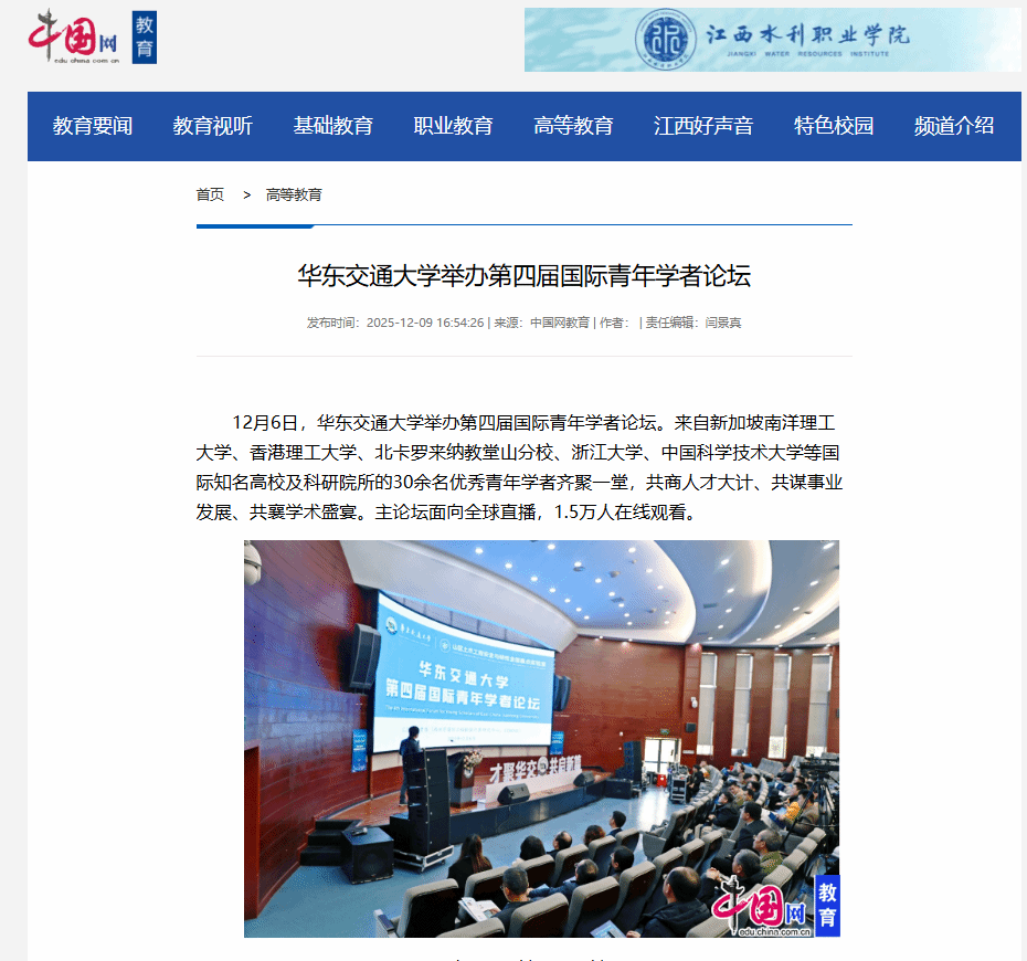 12月6日,华东交通大学举办第四届国际青年学者论坛。来自新加坡南洋理工大学、香港理工大学、北卡罗来纳教堂山分校、浙江大学、中国科学技术大学等国际知名高校及科研院所的30余名优秀青年学者齐聚一堂,共商人才大计、共谋事业发展、共襄学术盛宴。主论坛面向全球直播,1.5万人在线观看。