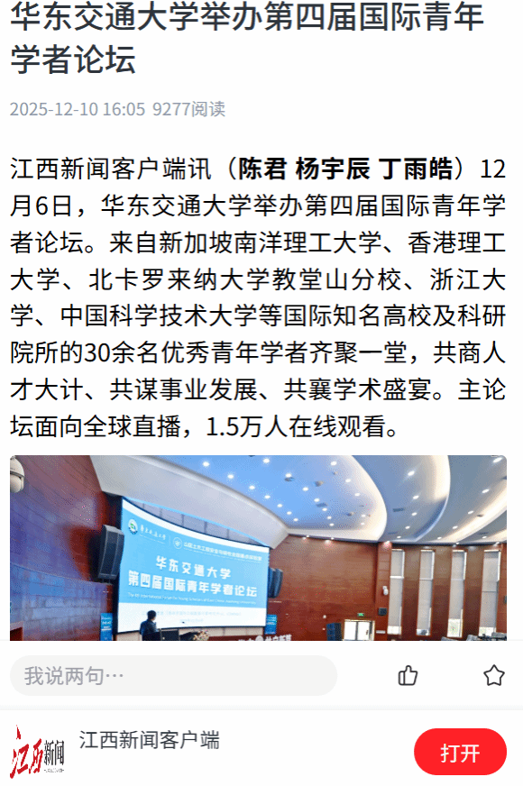 12月6日,华东交通大学举办第四届国际青年学者论坛。来自新加坡南洋理工大学、香港理工大学、北卡罗来纳教堂山分校、浙江大学、中国科学技术大学等国际知名高校及科研院所的30余名优秀青年学者齐聚一堂,共商人才大计、共谋事业发展、共襄学术盛宴。主论坛面向全球直播,1.5万人在线观看。