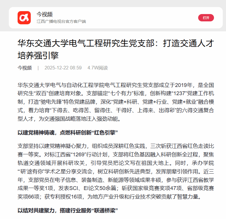 华东交通大学电气与自动化工程学院电气工程研究生党支部成立于2019年,是全国研究生“双百”创建培育对象。支部锚定“七个有力”标准,创新构建“1237”党建工作机制,打造“驰电先锋”特色党建品牌,深化“党建+科研、党建+行业、党建+就业”融合模式,着力培育“下得去、吃得苦、留得住、干得好、上得来、出得彩”的六得交通复合型人才,为交通强国战略落地注入强劲动能。