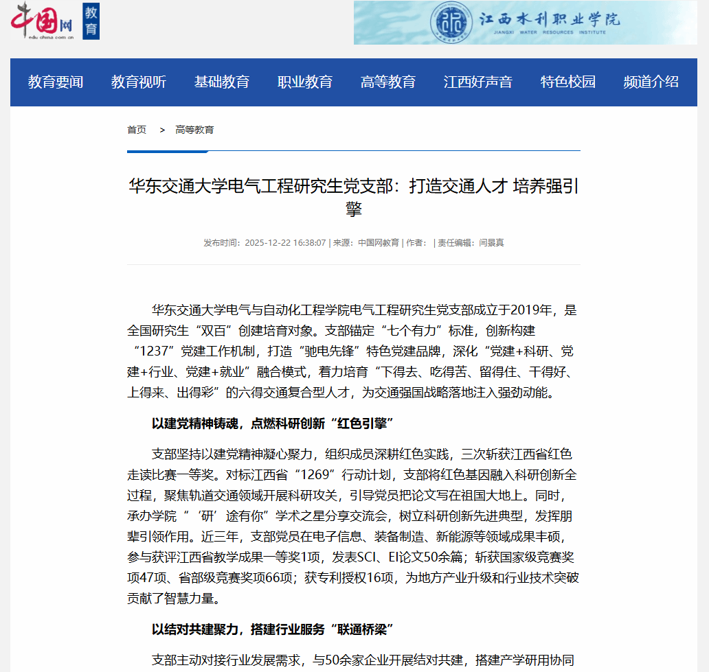 华东交通大学电气与自动化工程学院电气工程研究生党支部成立于2019年,是全国研究生“双百”创建培育对象。支部锚定“七个有力”标准,创新构建“1237”党建工作机制,打造“驰电先锋”特色党建品牌,深化“党建+科研、党建+行业、党建+就业”融合模式,着力培育“下得去、吃得苦、留得住、干得好、上得来、出得彩”的六得交通复合型人才,为交通强国战略落地注入强劲动能。