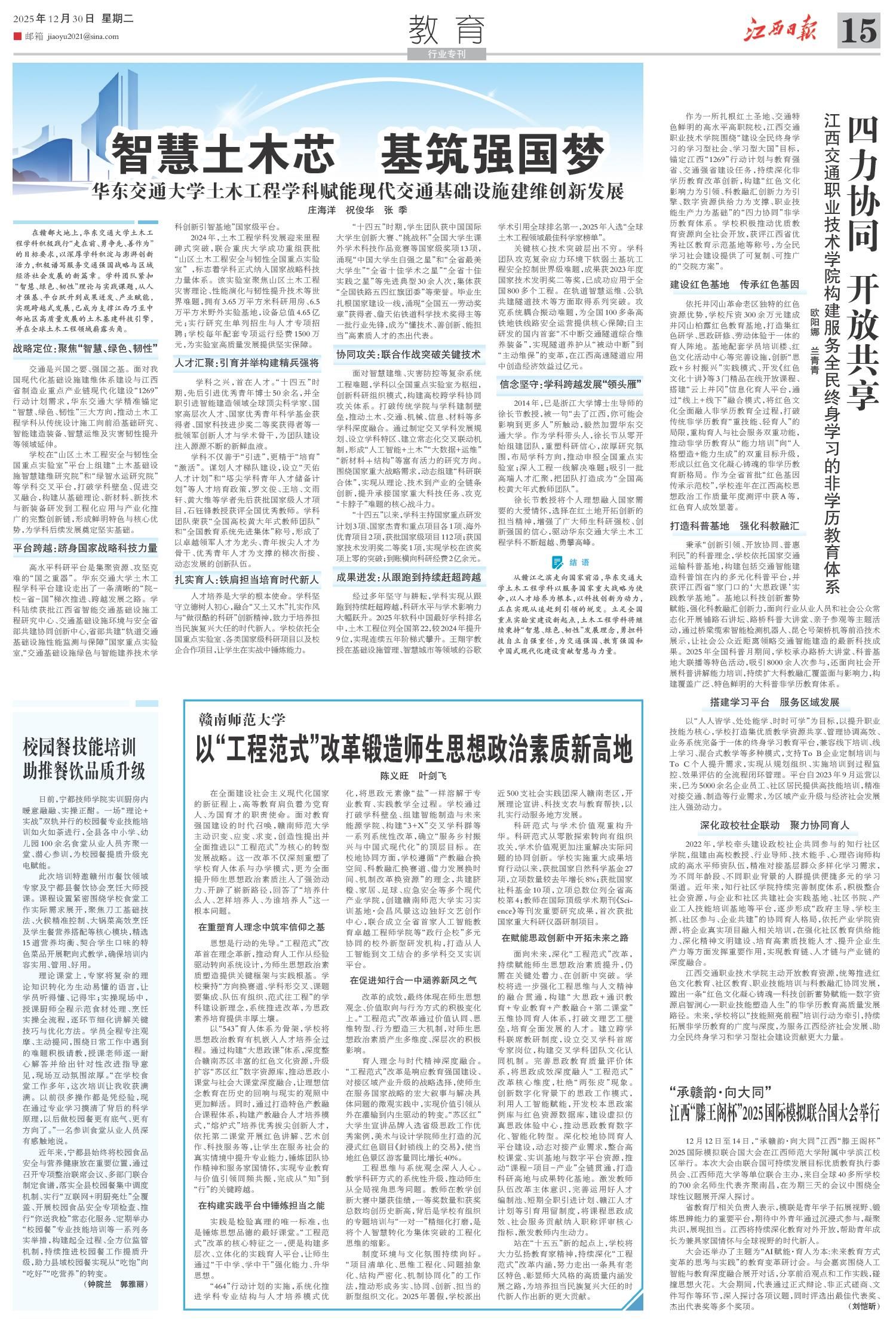 在赣鄱大地上,华东交通大学土木工程学科积极践行“走在前、勇争先、善作为”的目标要求,以深厚学科积淀与澎湃创新活力,积极谱写服务交通强国战略与区域经济社会发展的新篇章。学科团队紧扣“智慧、绿色、韧性”理论与实践课题,从人才强基、平台跃升到成果迸发、产业赋能,实现跨越式发展,已成为支撑江西乃至中部地区高质量发展的土木基建科技引擎,并在全球土木工程领域崭露头角。
