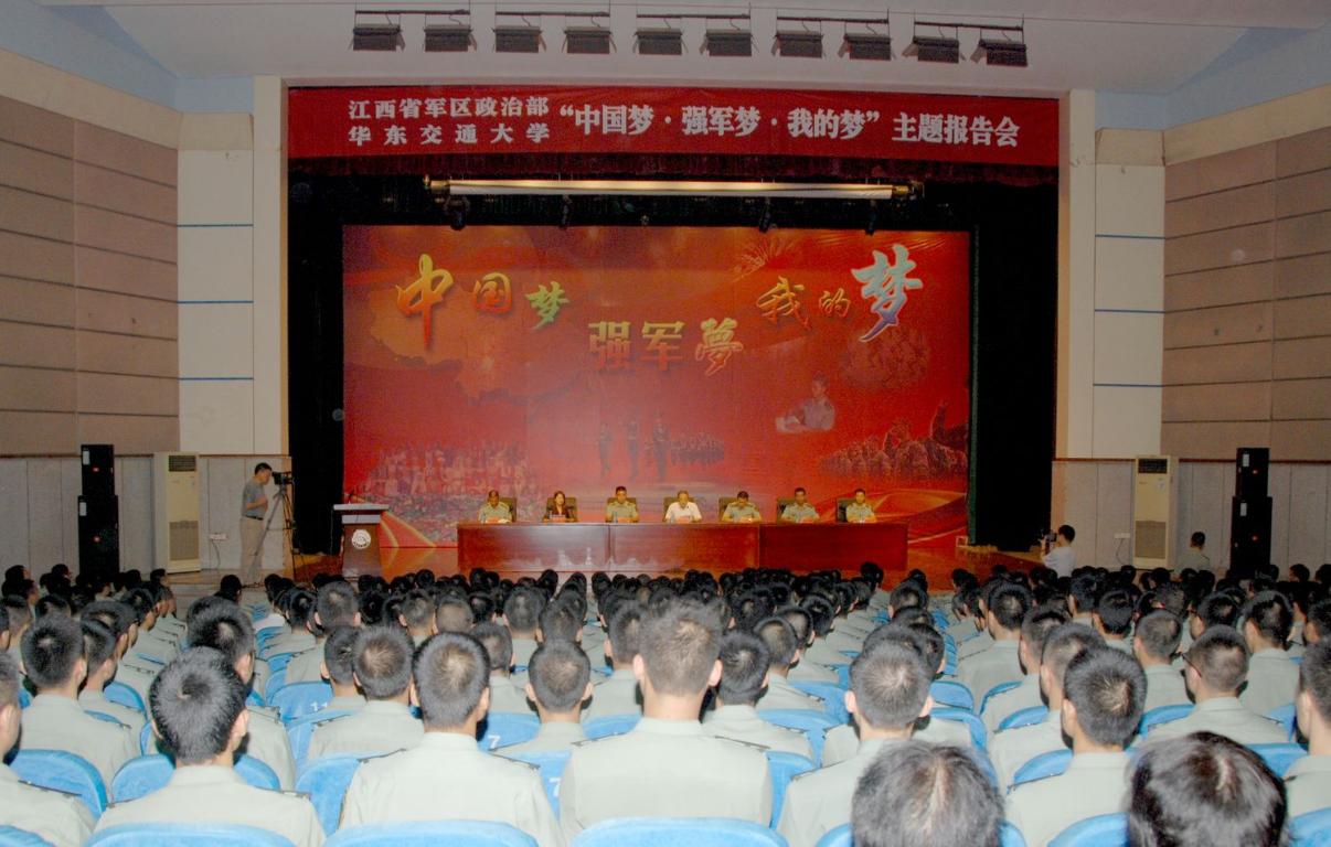 9月15日,江西省军区政治部和我校共同举办的“中国梦·强军梦·我的梦”主题报告会在我校举行,江西省委常委、省军区政委陶正明,江西省军区政治部副主任黄恩华,校党委书记万明、校长雷晓燕出席报告会。